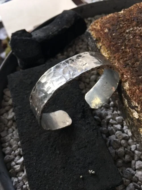 All of her pieces are made from sterling silver or copper with textures and patterns hammered into the surface by hand. The resulting subtle, surprising design elements make each piece unique.